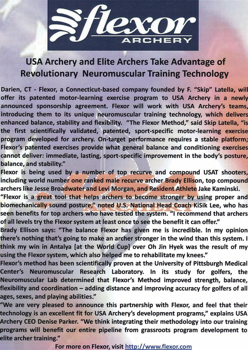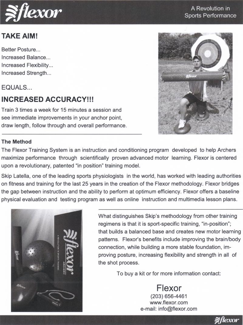 We have been using the Flexor Training System with our archers since January 2012. We have seen the difference that Flexor training can make and our archers have felt the difference; increased balance, flexiblity and core strength. This has resulted in increased accuracy and consistency. We courage all archers to investigate the Flexor Training System and have a look at how flexor can help you, or check out their website at www.flexor.com